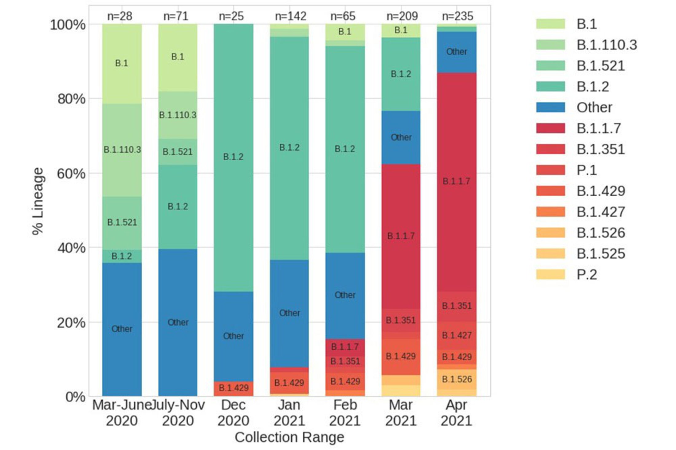 But there is some concern that the variants pose a threat to people who haven’t been vaccinated yet. The dominant strain for April, the U.K. variant, is also called B.1.1.7. It’s represented in red in the chart at the top of this story. You can see it starts to show up in February and takes over in just two months.