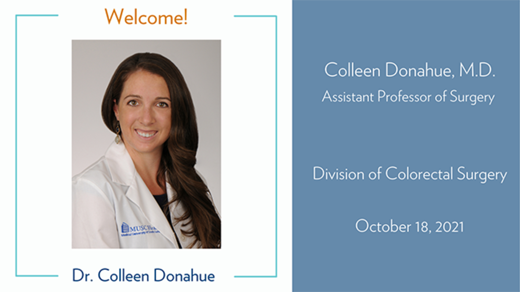 Colleen Donahue, M.D. joins the MUSC Department of Surgery as an Assistant Professor of Surgery in the division of Colorectal Surgery. Dr. Donahue completed her colon and rectal fellowship at John H. Stroger Jr. Hospital. During her fellowship training, she held the academic appointment of Associate Clinical Instructor in Surgery at Rush University in Chicago.
