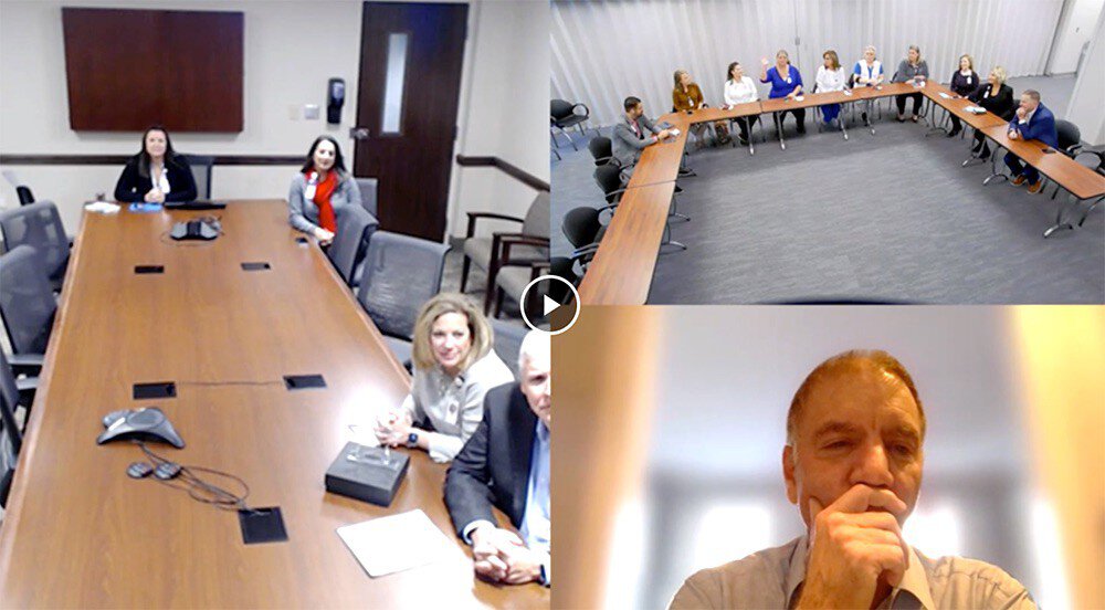 MUSC Health's Brittany Hempton, top right photo, raises her hand during a virtual presentation of the Values in Action Compassion award from President David Cole and Kathy Cole.