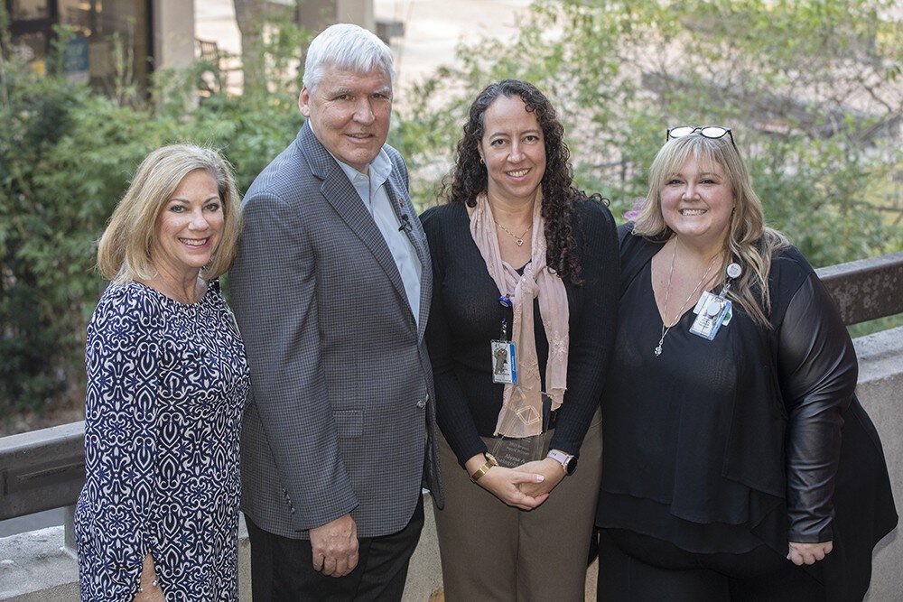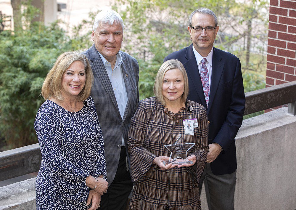 Values in Action Impact award winner Dr. Alyssa Rheingold, second right, accepts the award from the Coles and nominator Meg Wallace, right, Department of Psychiatry and Behavioral Sciences.