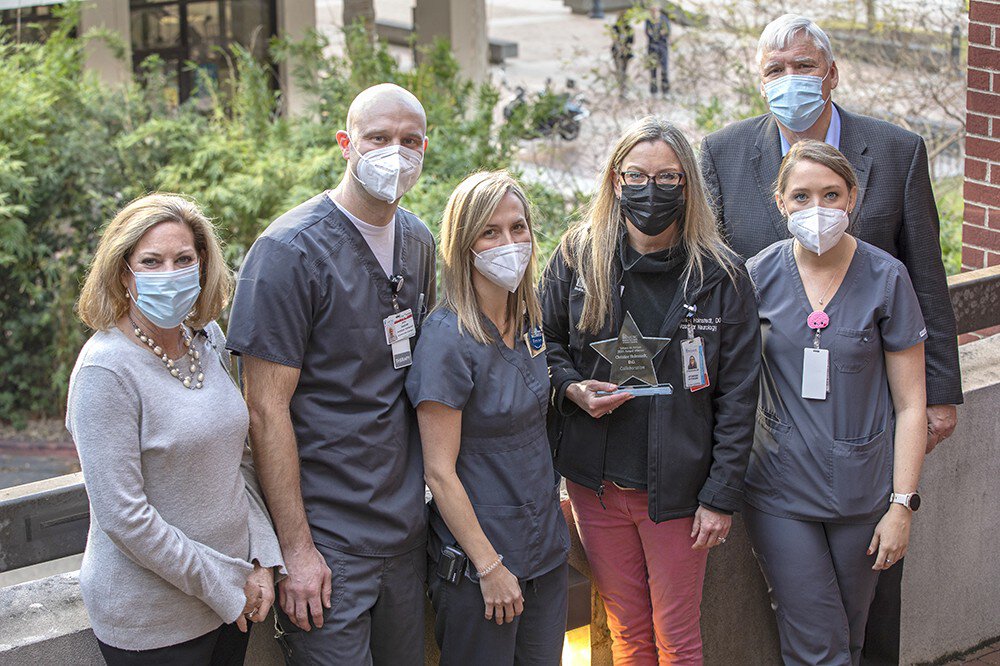 Department of Neurology's Dr. Christine Holmstedt, third from right, accepts the Values in Action award for Collaboration from the Coles and rehabilitation colleagues.
