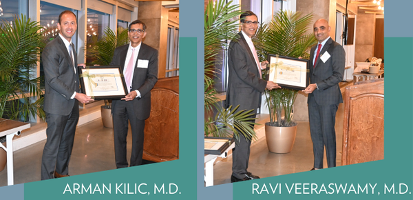 Arman Kilic, M.D. and Ravi Veeraswamy, M.D., newly named endowed chairs in the divisions of Cardiothoracic Surgery and Vascular Surgery, were honored along with four endowed chair honorees in the MUSC Health Heart and Vascular Center: Daniel P. Judge, M.D., Daniel H. Steinberg, M.D., Ryan J. Tedford, M.D., and Jeffrey R. Winterfield, M.D. during the MUSC Department of Surgery and MUSC Health Heart & Vascular Center Endowed Chair Investiture Ceremony in the presence of nearly 100 family members, colleagues, leaders, and donors.