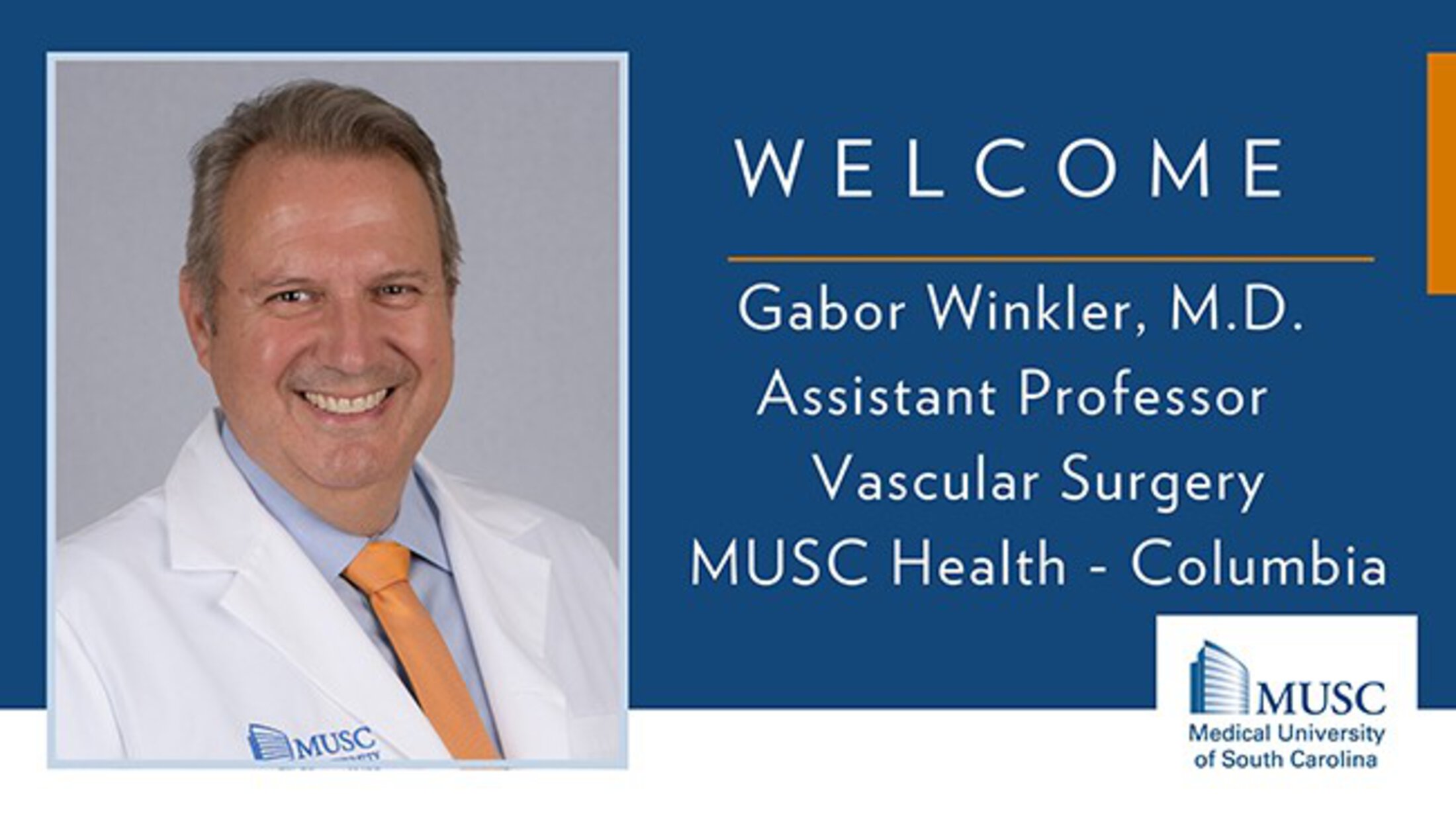 Vascular surgeon Gabor Winkler, M.D. is a double-board certified, fellowship-trained vascular surgeon who will provide comprehensive vascular services to patients at MUSC Health – Columbia. Dr. Winkler treats patients with a wide range of vascular disease including aortic aneurysms, peripheral arterial disease using advanced minimally invasive techniques, carotid disease, dialysis access care and vein care. His patient care philosophy is to build a strong, trusting relationship and develop a plan of care specific to each patient through shared-decision making.