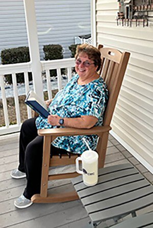 Debbie Grenier relaxing on her porch just a month after surgery.