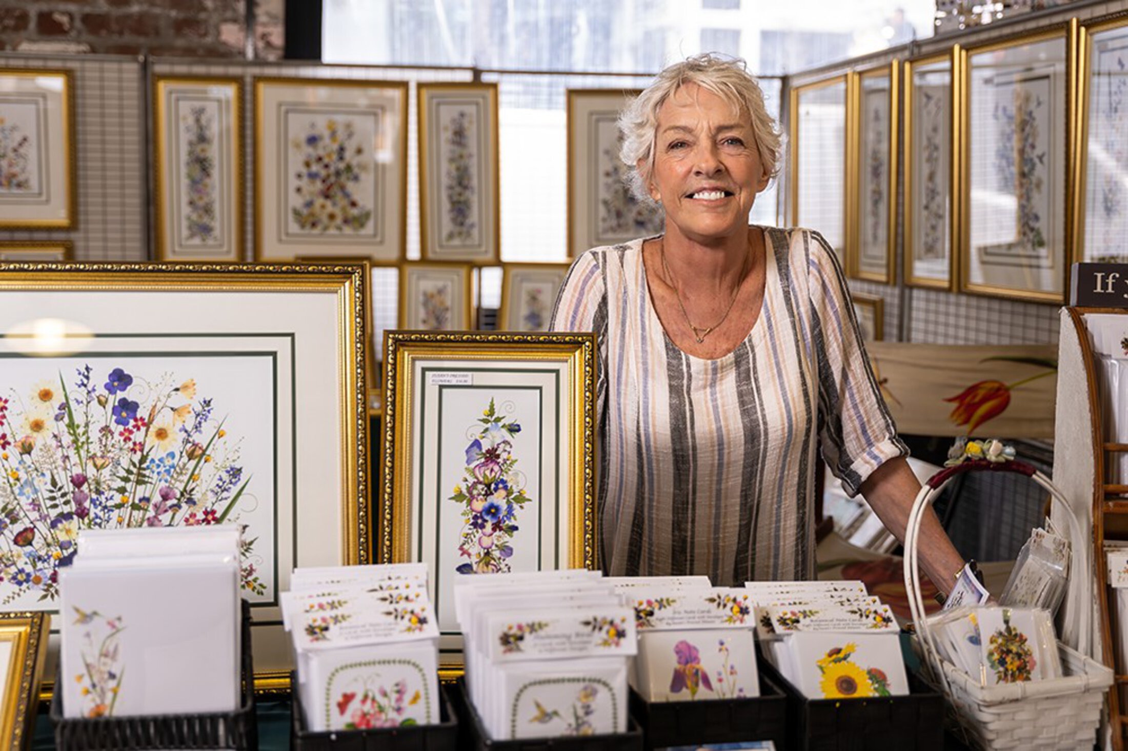 Fast forward 40 years, and where does Shelton spend her time? Sunday through Wednesday, she and her husband, Charlie, are at the market where she’s built her business, Susan’s Pressed Flowers, using flowers from her garden and the pressed flower technique that her mother taught her.