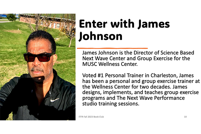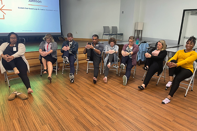 Mr. James Johnson, a personal trainer and Director of Science-Based Next Wave Center and Group Exercise at the MUSC Wellness Center led us through an amazing chair-based yoga and creative movement session. During this time, he introduced the group to various poses that helped encourage strength and mindful breathing. In the opening of Chapter 4, Hrach discusses her own experience using yoga to begin class with “…a series of gentle neck movements…leading students through slow inhaling and exhaling as I count and model the movements.” p. 107