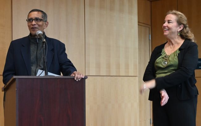 Chair Prabhakar Baliga, M.D., with Vera Ford at the podium.