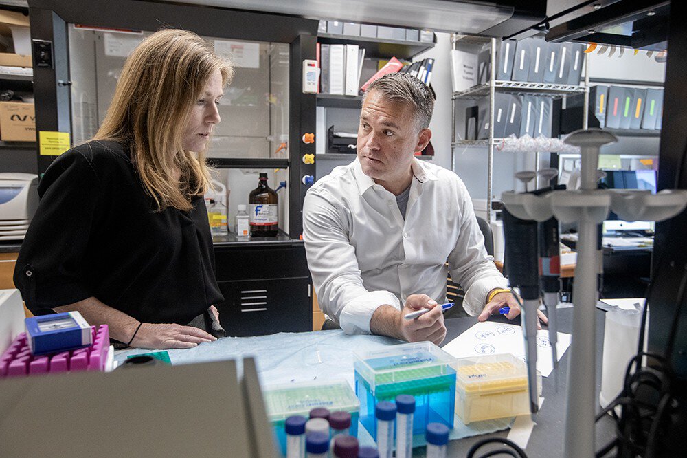 MUSC Chief Innovation Officer Jesse Goodwin talks with Hollings Cancer Center investigator Nathan Dolloff, whose work focuses on developing new cancer immunotherapies. Photo by Sarah Pack