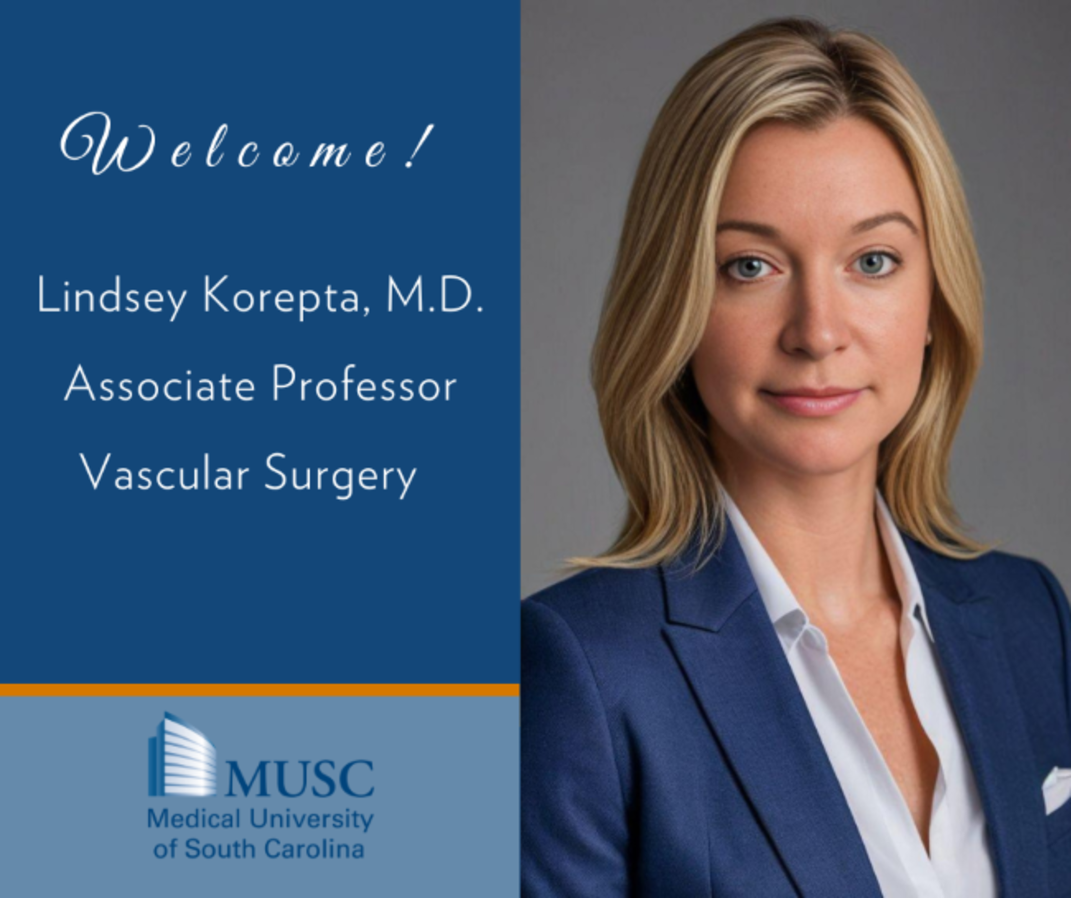 The MUSC Department of Surgery is pleased to announce that vascular surgeon Lindsey Marie Korepta, M.D., RPVI, joins the MUSC Department of Surgery as an associate professor, effective June 3. Dr. Korepta joins MUSC from Loyola University Chicago Medical Center and previously Brigham and Women’s Hospital in Boston. Her contributions to the field of vascular surgery are many. She has a strong interest in women's health and the treatment of aortic disease, carotid disease, hemodialysis access, and lower extremity venous and peripheral artery disease.