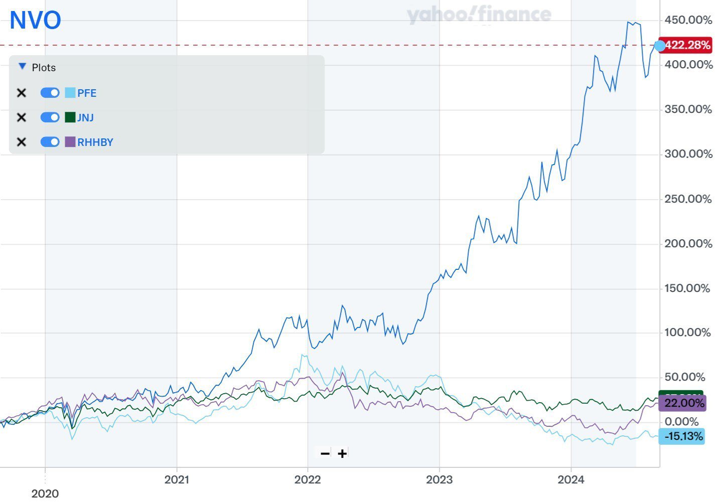 Novo Nordisk (NVO) stock growth compared to pharma giants Pfizer (PFE), Johnson & Johnson (JNJ), and Roche (RHHBY).