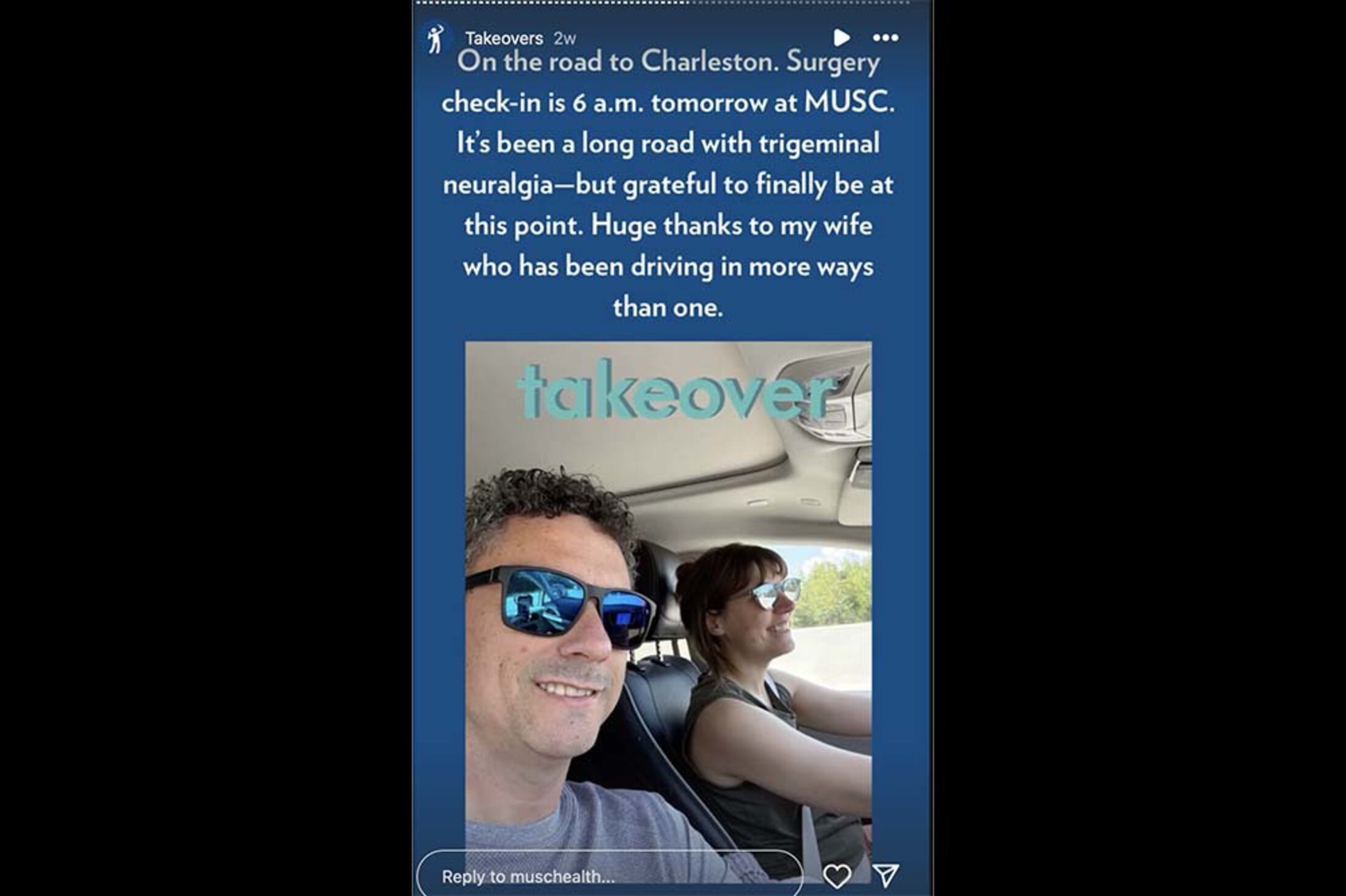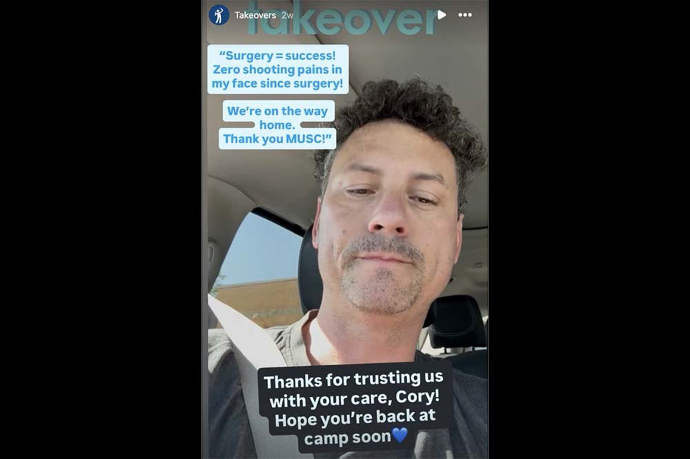 “I'm excited to be heading home. But thanks for the opportunity to share what's going on. Thanks for listening. And as always, if you want to drop a message or comment, and this is also something that you're struggling with, maybe you've been diagnosed with trigeminal neuralgia and are wondering about the microvascular decompression surgery from somebody who's had it, then feel free to reach out to the social media channels here. I'm sure they'll pass my information on. But overall, 10 out of 10 experience, so thank you, MUSC.”